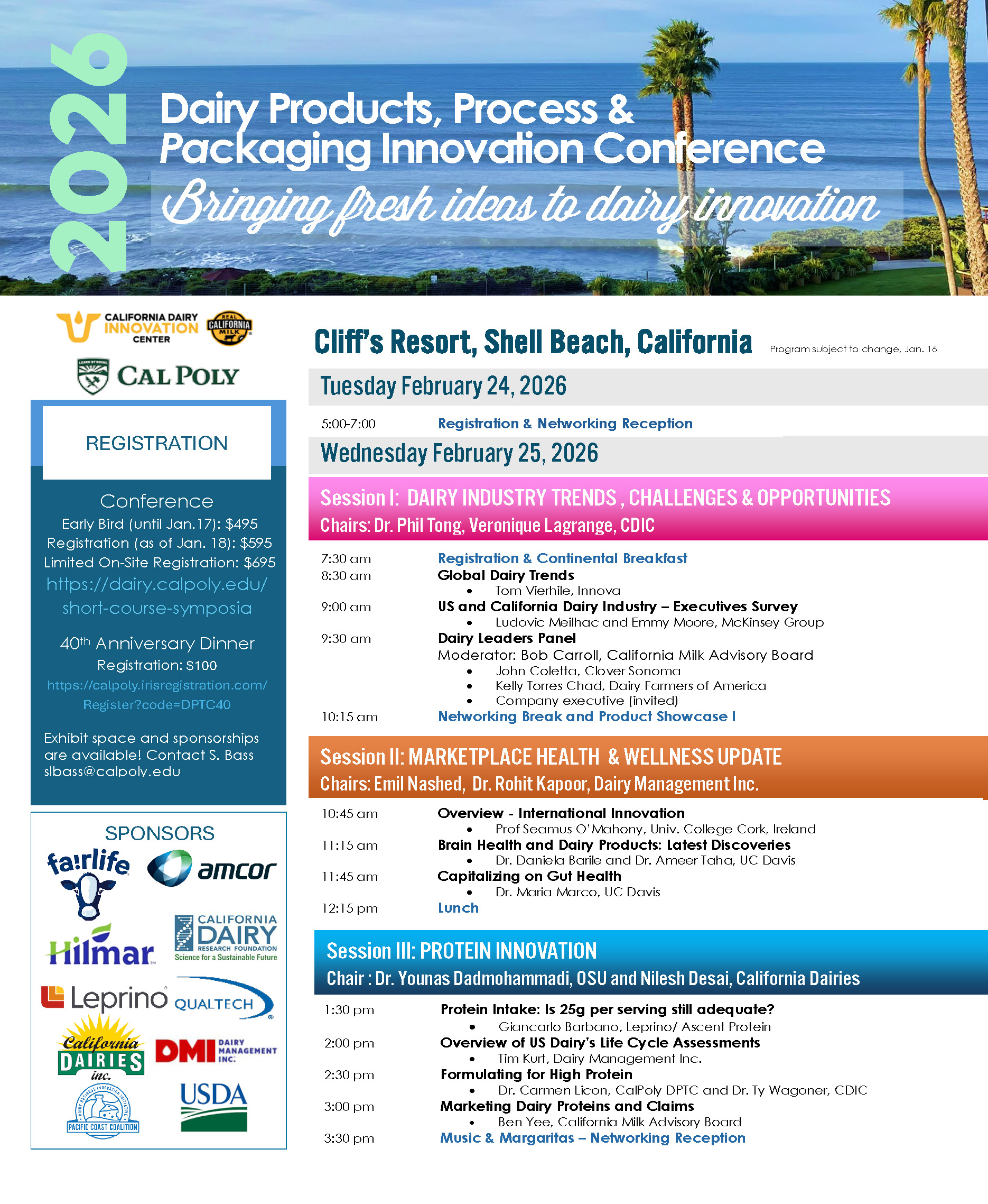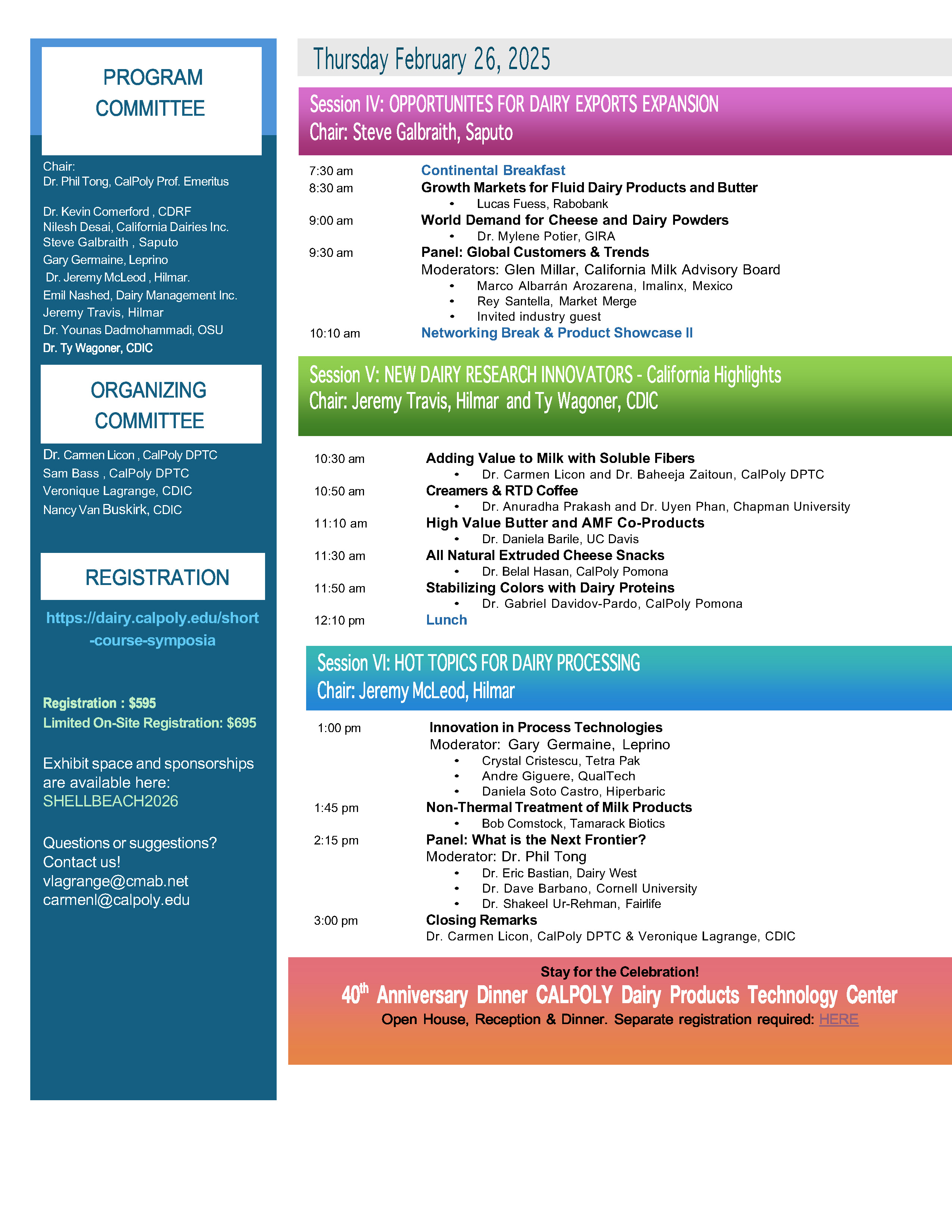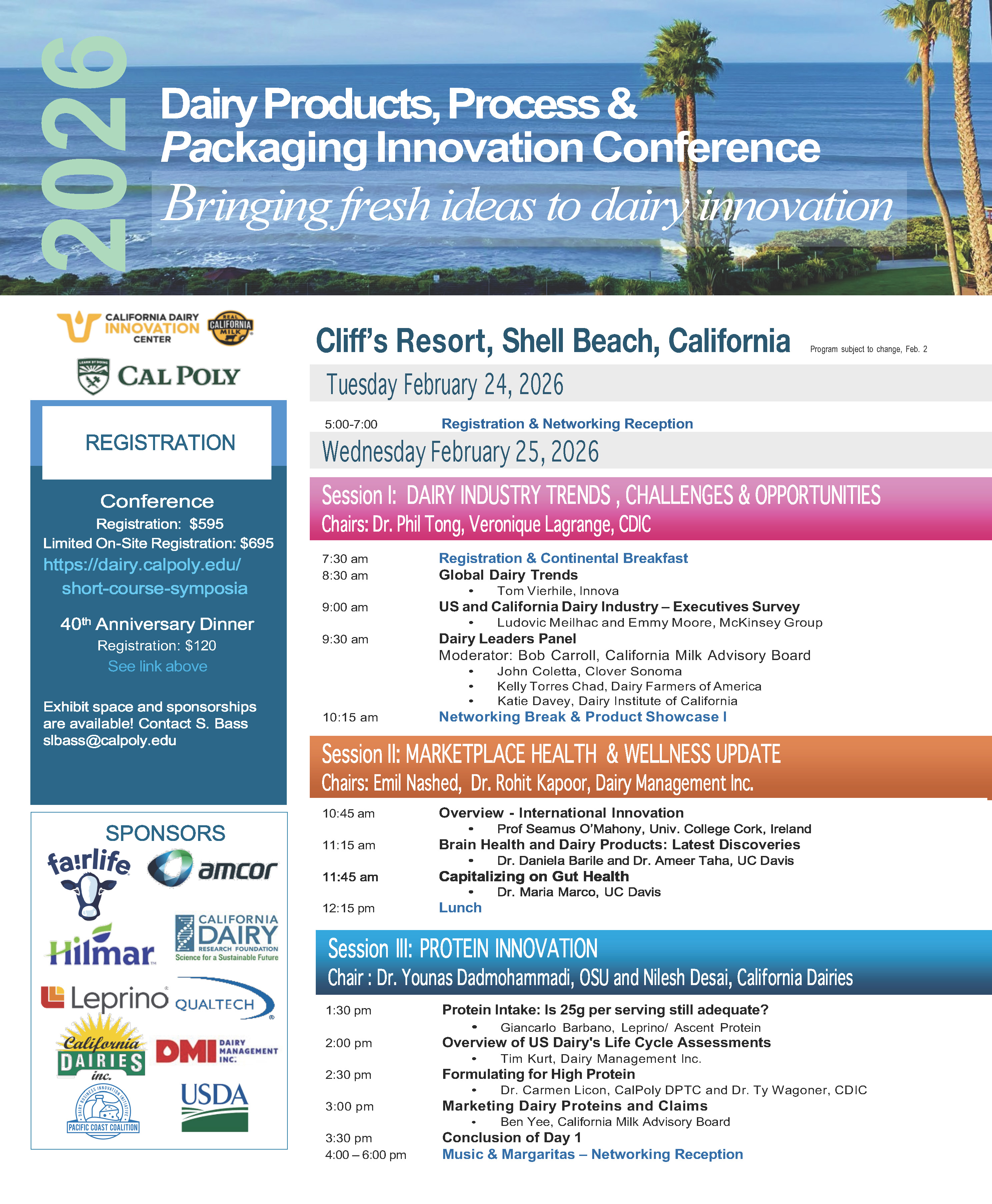 Dairy industry professionals are invited to join the Cal Poly Dairy Products Technology Center in picturesque Shell Beach, CA for three days to learn in depth about dairy marketplace innovation, recent enhancements made to dairy processing and packaging and improved marketing. Hear from today's leaders and entrepreneurs as they share their insight and experience in today's dairy industry.