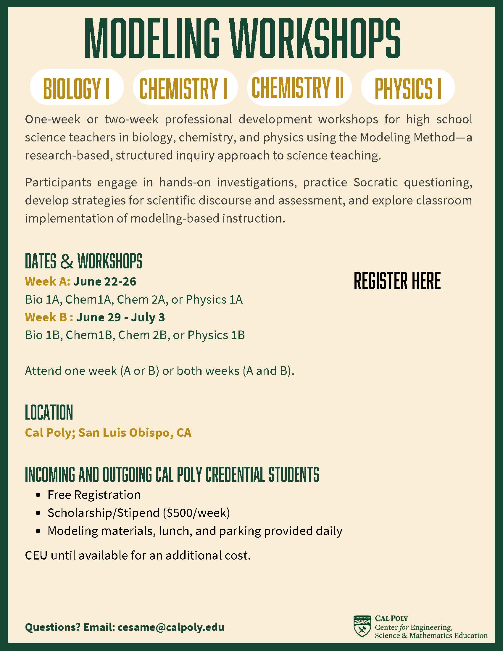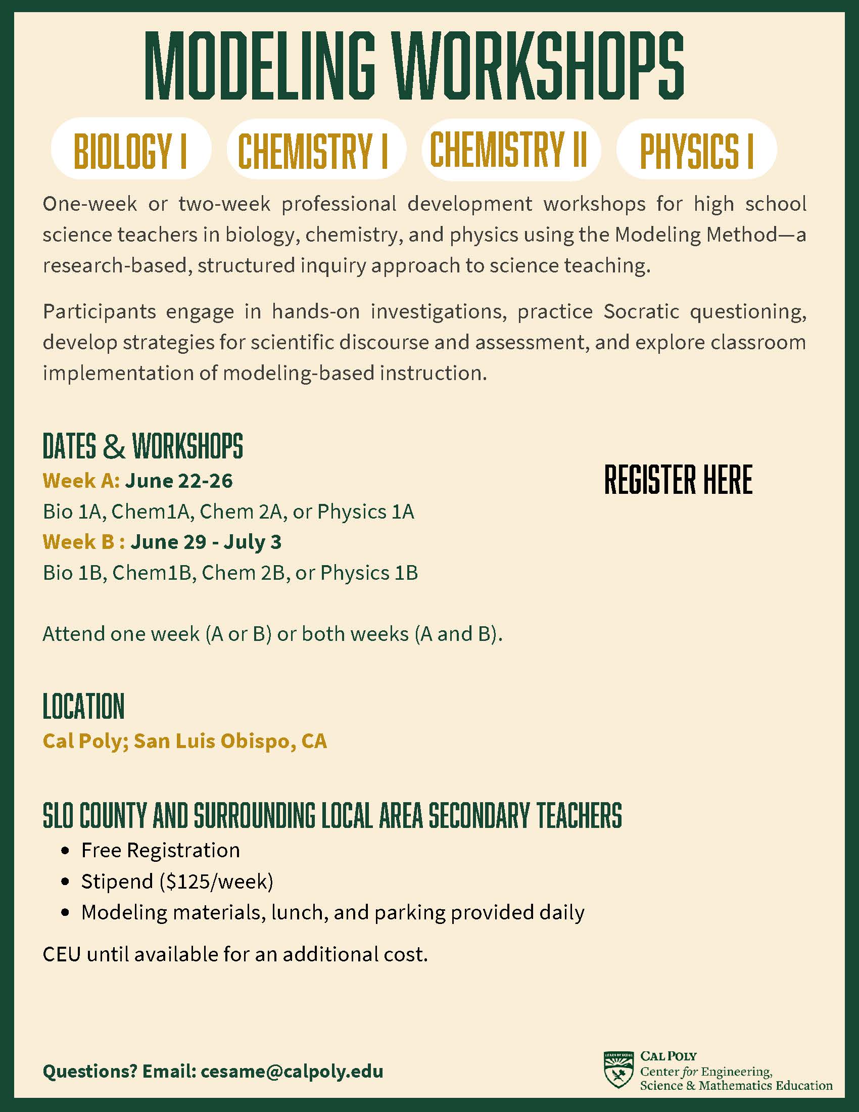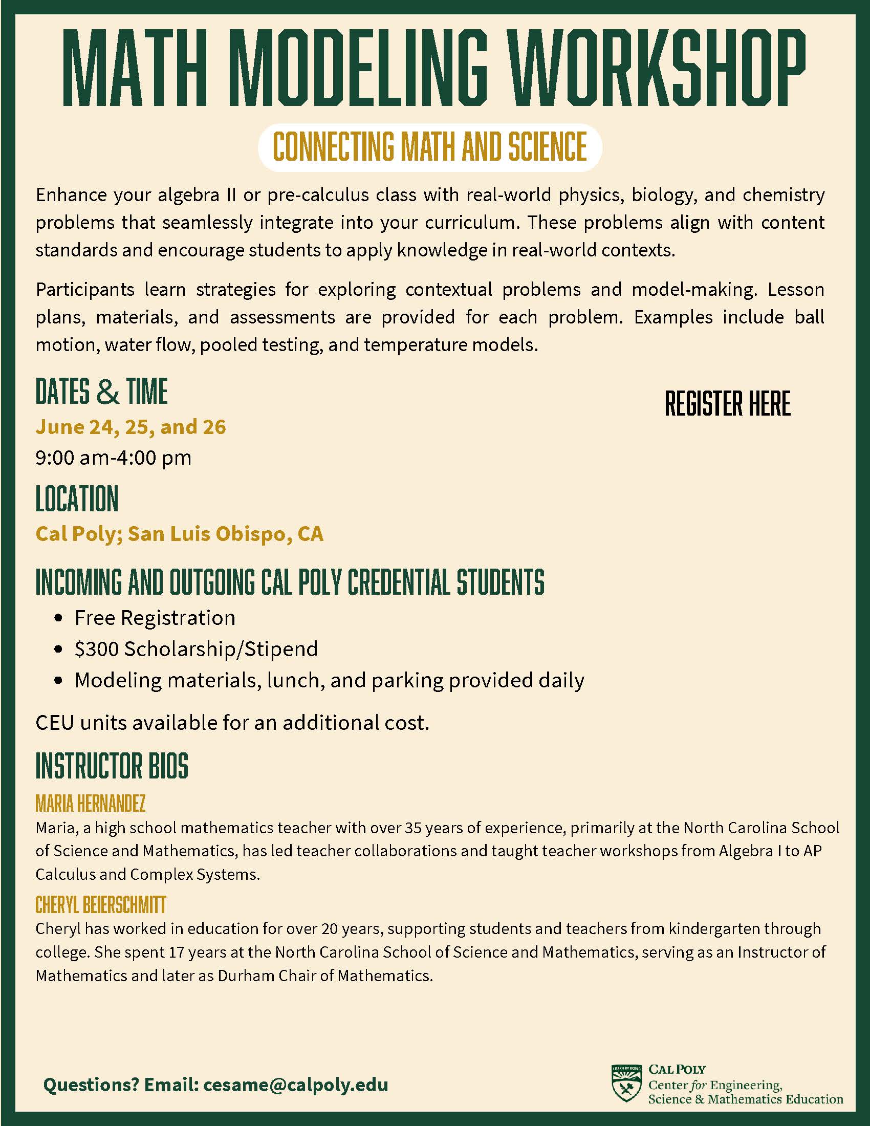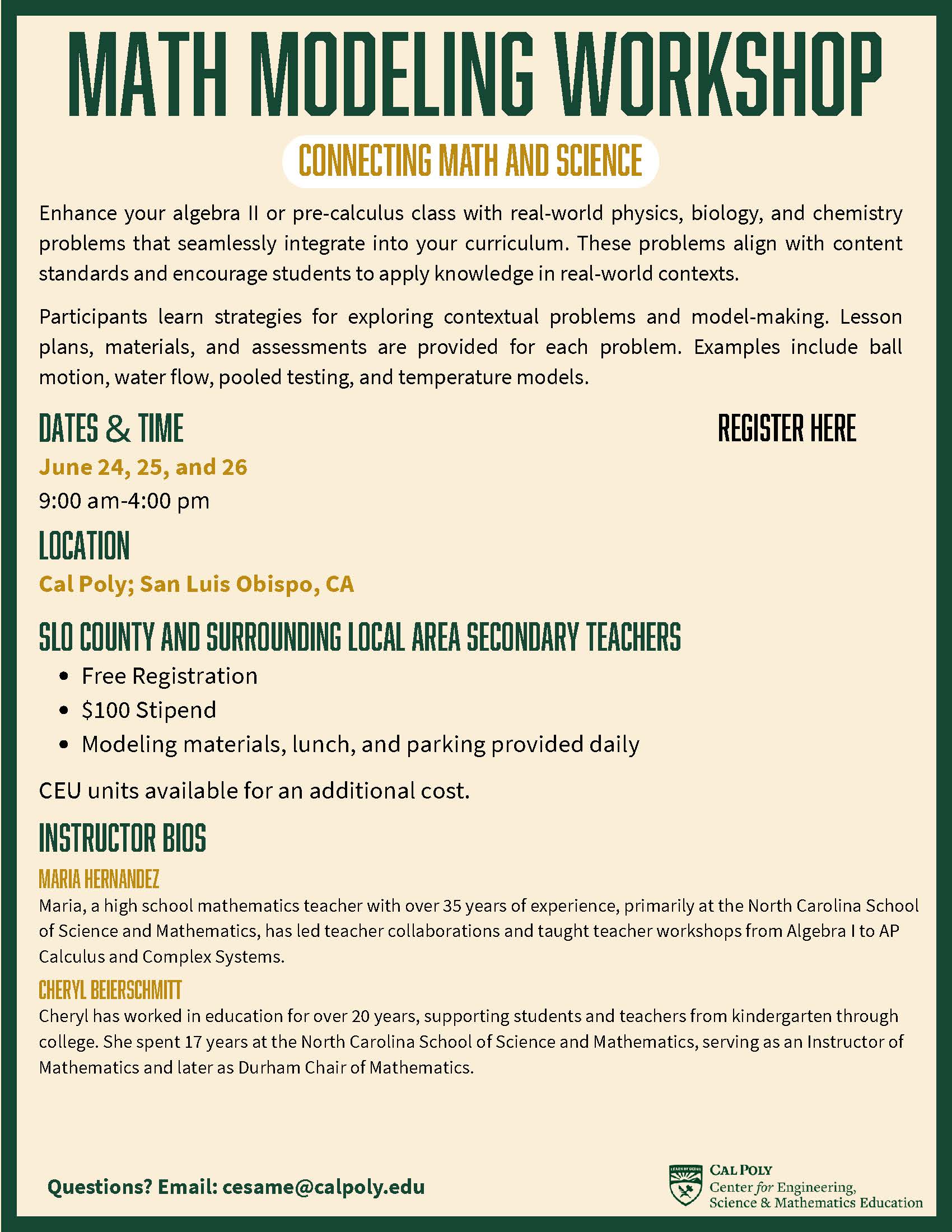 For more information, please email: cesame@calpoly.edu