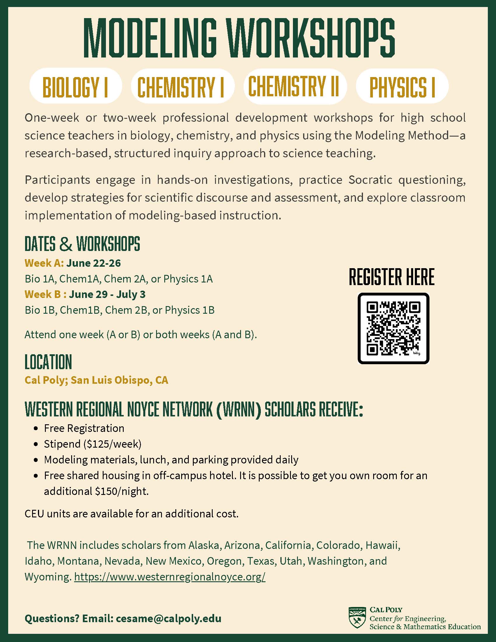 Cal Poly’s Center for Engineering, Science, and Mathematics Education (CESAME), in partnership with the Western Regional Noyce Network, is pleased to offer one-week and two-week summer professional development workshop in science modeling and a three-day workshop in math modeling.